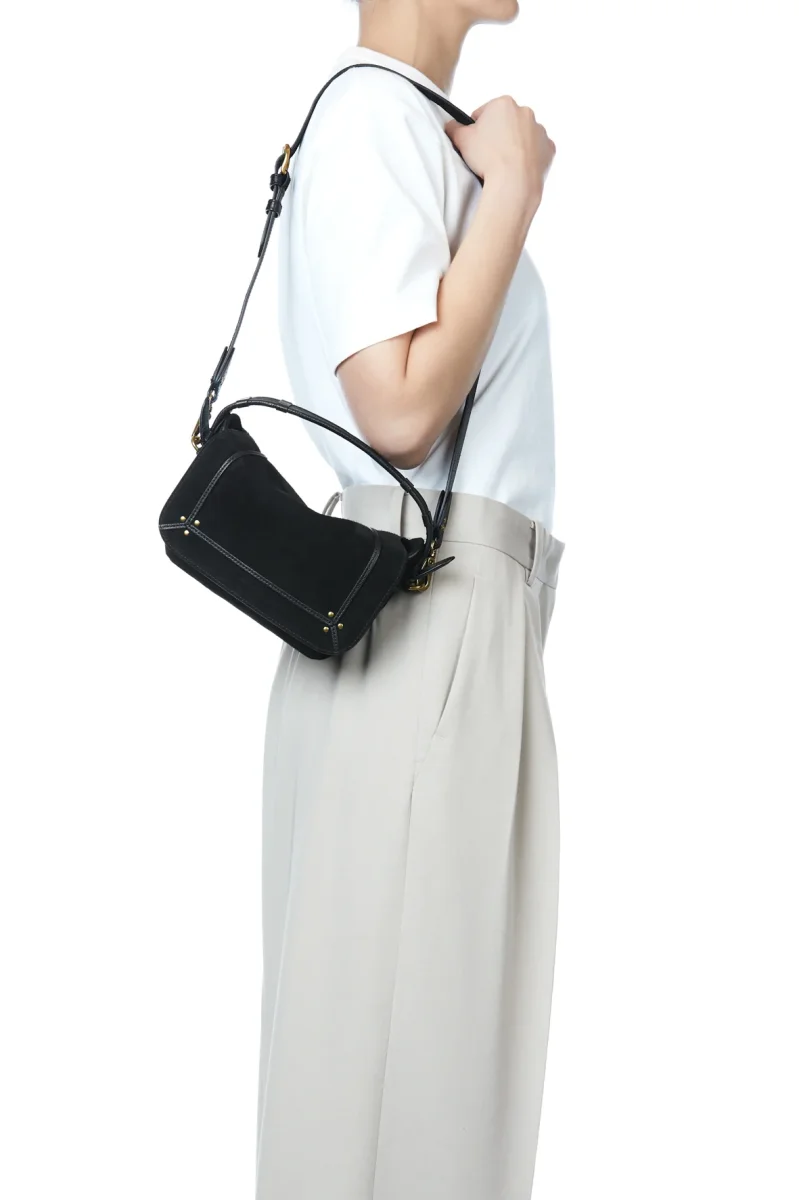Une anse en cuir matelassée et une longue bandoulière réglable et amovible de 70 cm à 97 cm. Fermeture par un rabat en cuir aimanté. Une poche extérieure zippée à l’arrière du sac. Un lien porte-clés à l’intérieur du sac. Un design épure, aux nombreux détails artisanaux minutieux et discrets et aux lignes déstructurées. Le travail de précision sur les quatre piqûres des anses met en valeur la qualité et le soin apportés à chaque détail. Les enchapes de la bandoulière et des anses présentent un relief évoquant les harnais d’équitation, ajoutant une touche d’élégance et de tradition.
