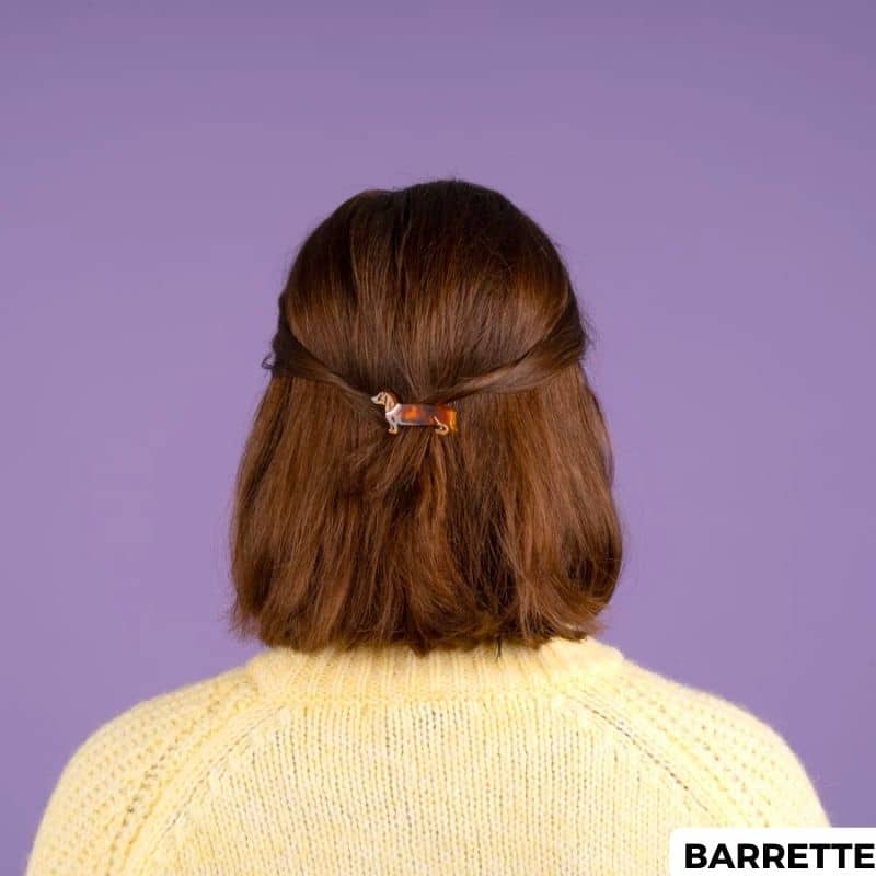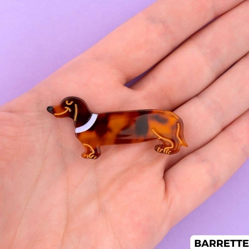 Avec sa petite langue qui pend, son joli pelage, ses traits dorés et son joli collier : la pince à cheveux teckel de la marque Coucou Suzette a tout pour plaire ! Un accessoire original pour donner du peps à votre coiffure, qui se décline en pince à cheveux crabe, en petite barrette ou en french barrette.