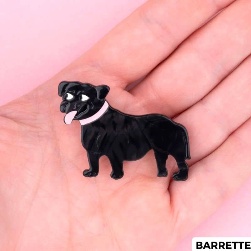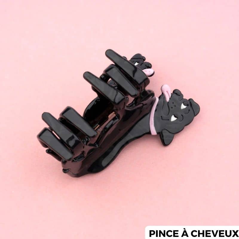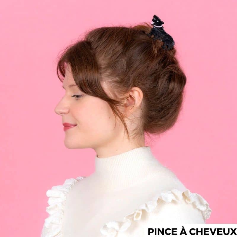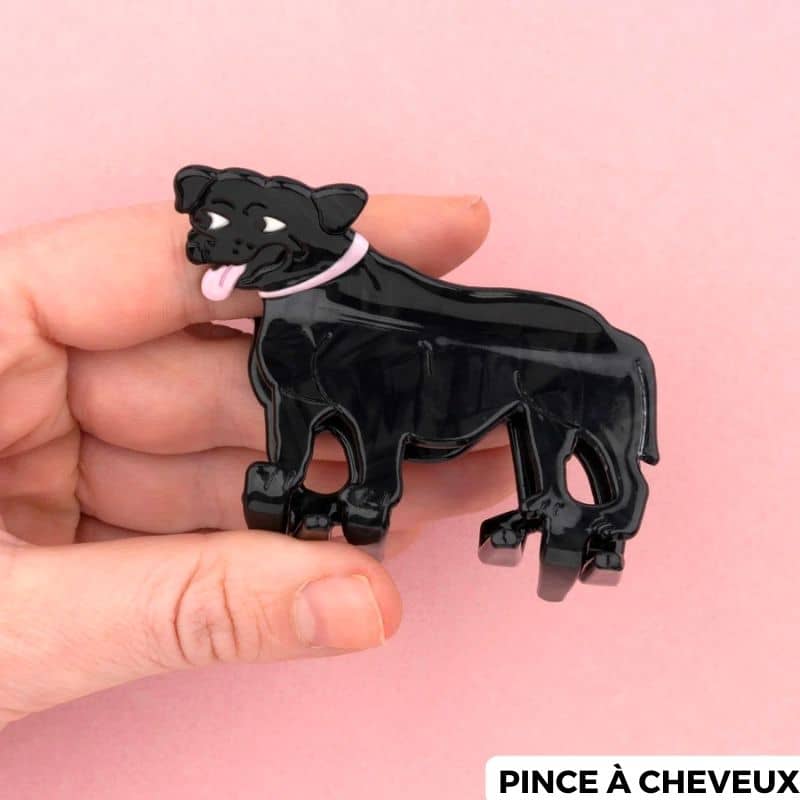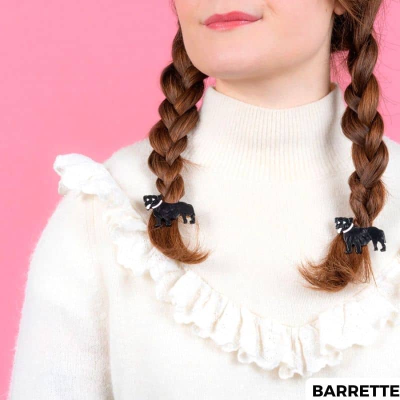 Qu’elle est mignonne la pince à cheveux staffie de la marque Coucou Suzette ! Avec sa couleur noire et ses détails roses, cette pince a tout pour plaire. Un accessoire original pour donner du peps à votre coiffure qui se décline en pince à cheveux crabe ou en petite barrette.
