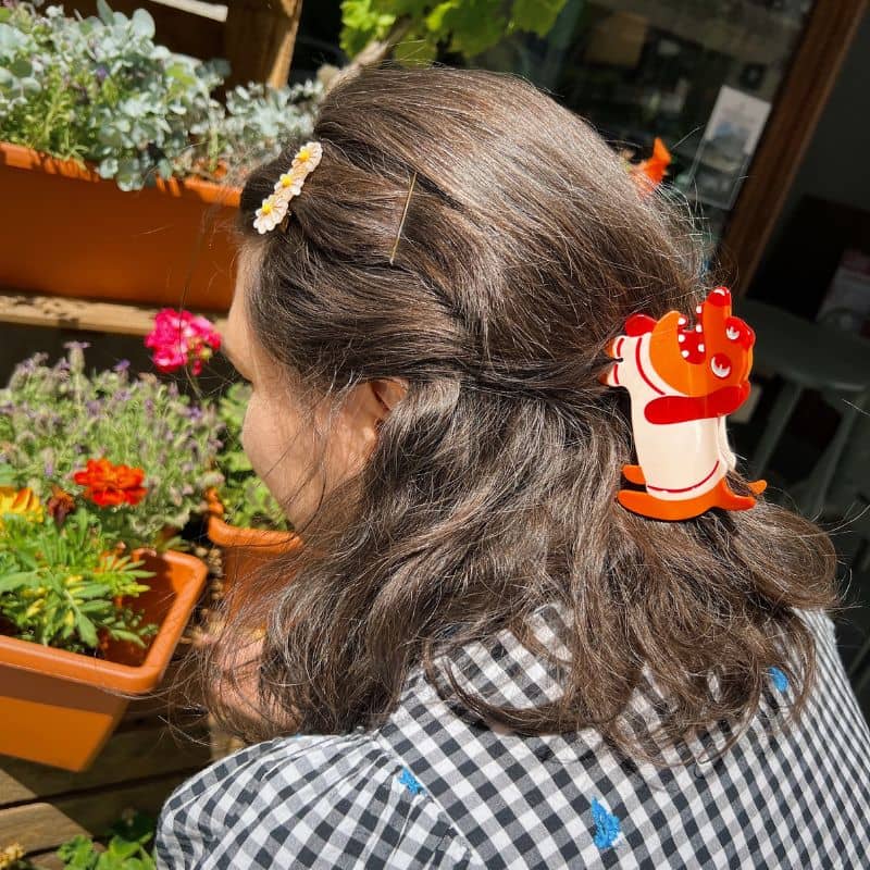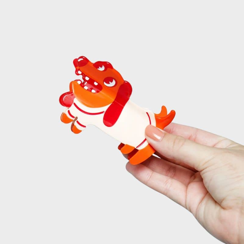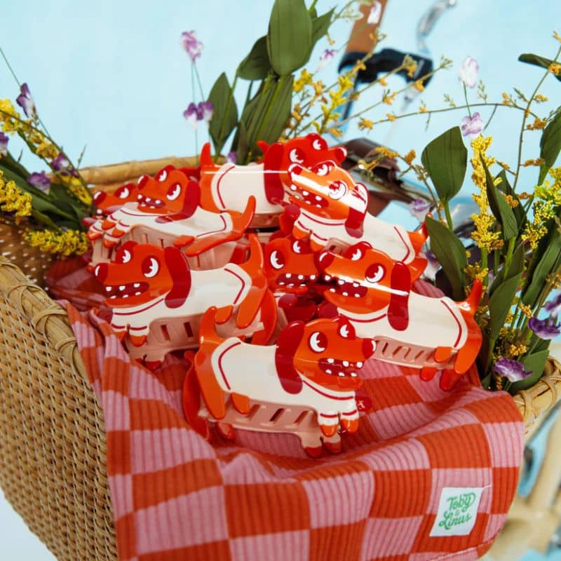 Pimpez vos coiffures avec la pince à cheveux Horace le teckel de la marque Toby & Linus ! Avec son design fun et sa taille XL, sa forme pince à cheveux crabe vous permettra de retenir et coiffer vos cheveux avec style !