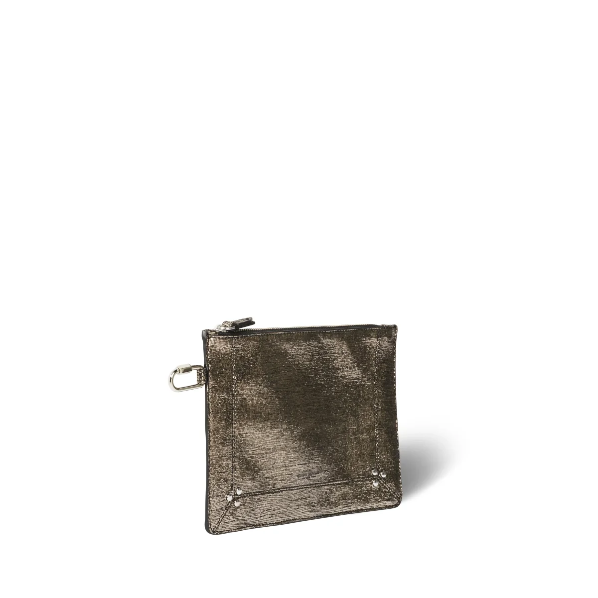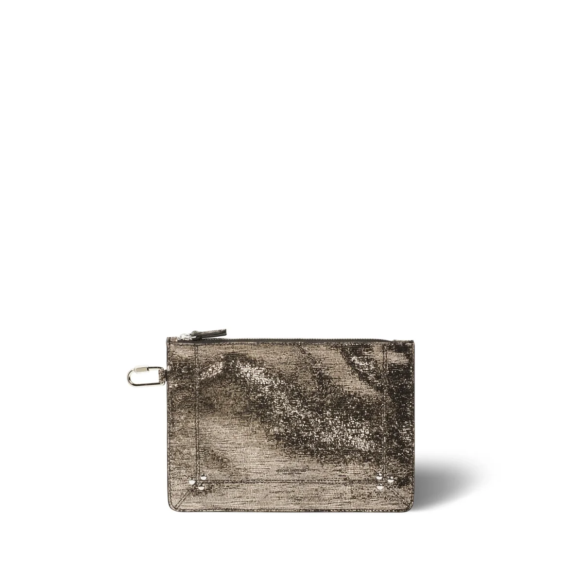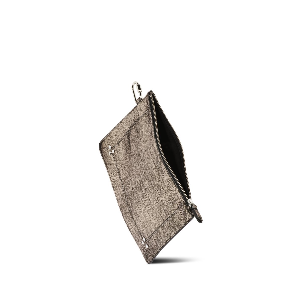 Fermeture entièrement zippée. Anneau pour l’accrocher au mousqueton présent dans les sacs de la Maison.