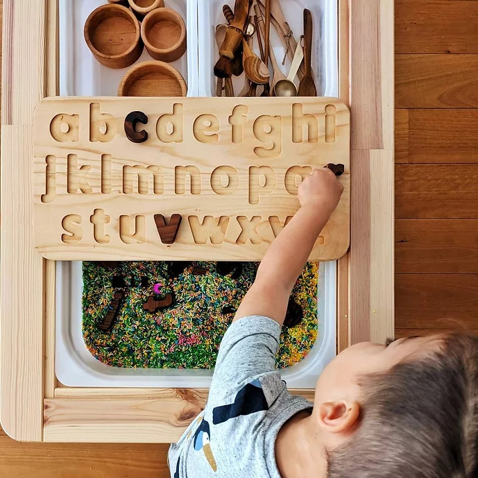 – Il peut également s’amuser à enlever toutes les lettres et à remplir les lettres creuses avec des graines, du riz ou nos boules de feutre en laine, ou encore passer le doigt pour comprendre petit à petit comment les écrire. Si on enlève toutes les lettres le jeu devient une planche de traçage et d’écriture.