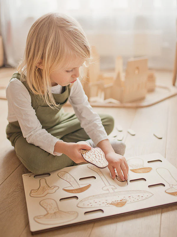 Ce jouet peut aussi servir de support créatif pour faire des dessins en pochoir ou par décalquage. Et une fois que ces champignons n’auront plus de secret pour lui, votre petit bout pourra même les peindre avec fierté.