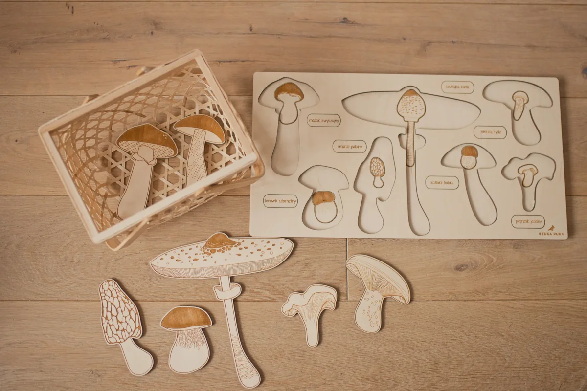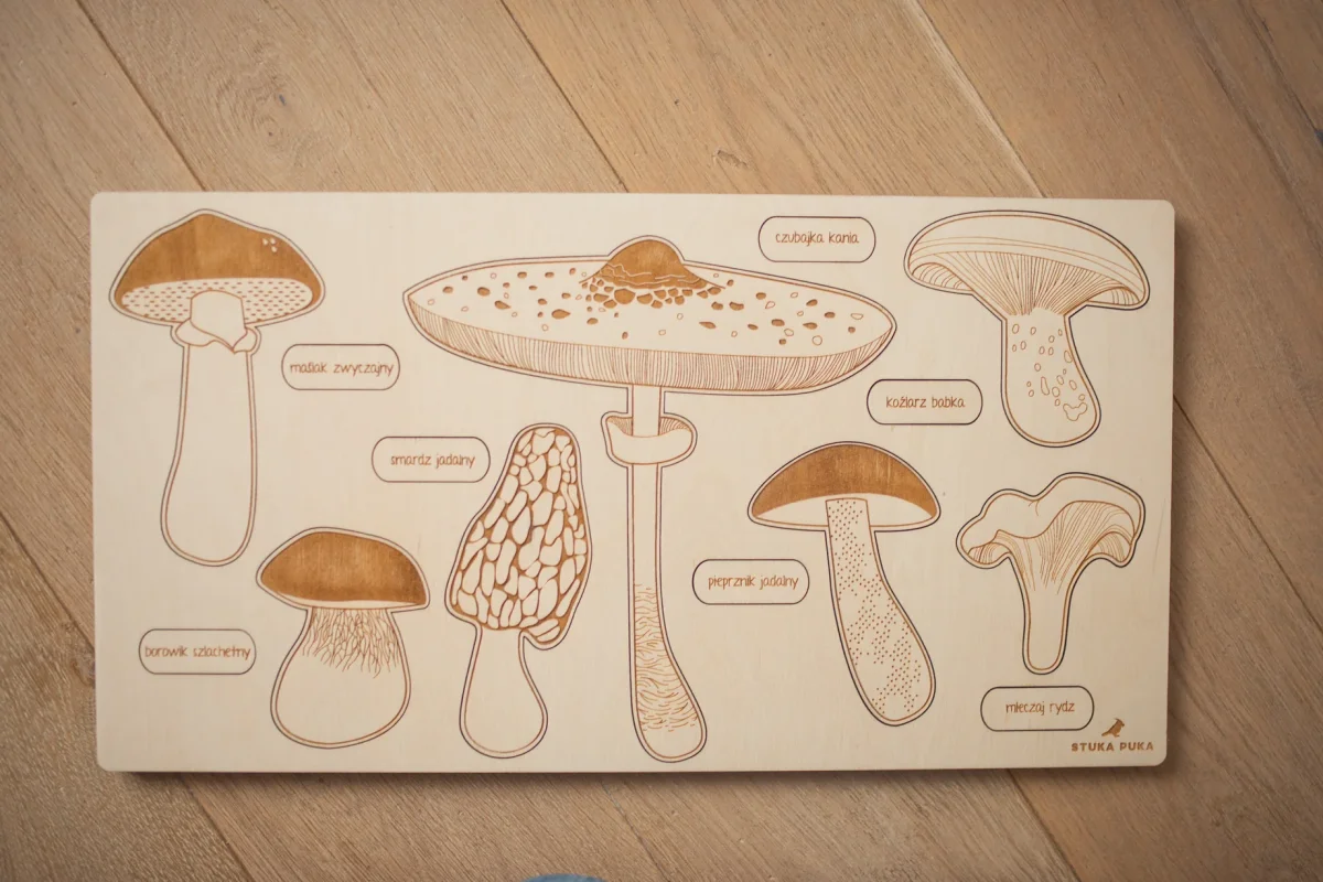 Magnifique et grand puzzle en bois multicouche qui permettra à votre enfant d’apprendre le nom des champignons comestibles, leur forme jeune et leur forme adulte.