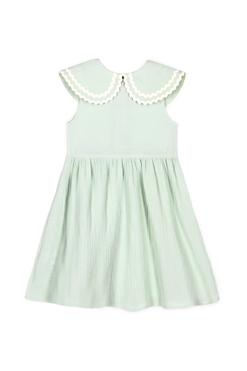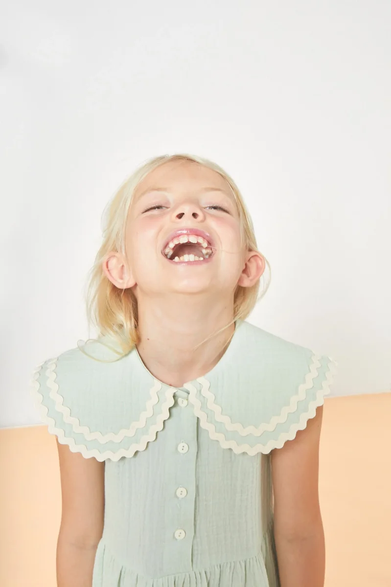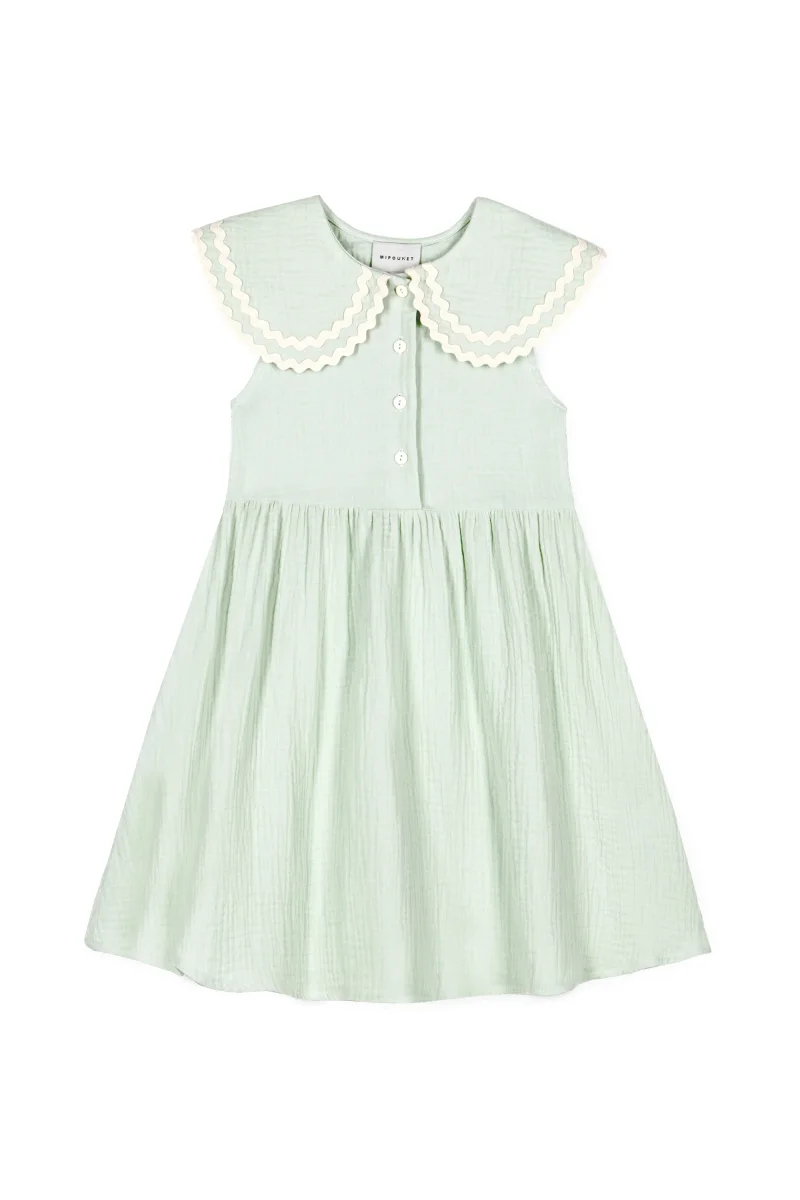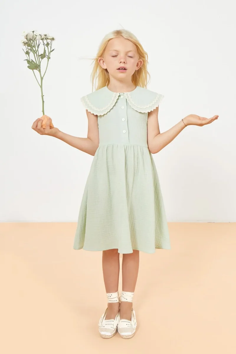 On craque pour le style preppy chic de la robe Alice. Tellement adorable avec sa couleur vert d’eau, son grand col claudine généreux souligné par sa bordure de ruban ondulé, détail signature de la marque. Votre fille sera assurément très à l’aise dans cette coupe évasée et cette mousseline de coton biologique légère et aérée. Une pièce sans manches parfaite pour les fortes chaleurs. Robe sans doublure mais complètement opaque.