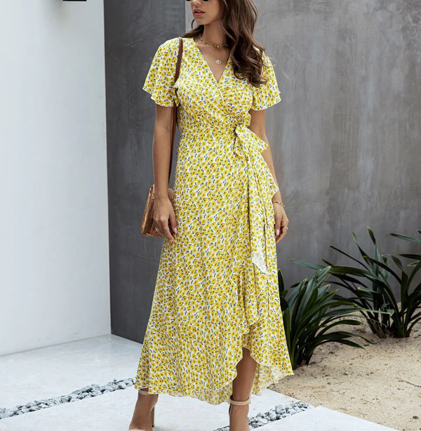 Cette robe cache-cœur florale élégante allie confort léger et design chic, parfaite pour les journées chaudes. Le profond décolleté en V et les manches courtes à volants créent une silhouette féminine et flatteuse, tandis que l’ourlet asymétrique apporte une touche aérienne et ludique. Grâce à la ceinture nouée à la taille, elle s’ajuste facilement pour mettre vos courbes en valeur. Légère et fluide, la matière vous garde au frais et élégante lors de vos sorties ou fêtes estivales. Son motif floral polyvalent se marie parfaitement avec des sandales ou des talons pour un look raffiné. Un choix idéal pour les femmes recherchant confort, style et élégance sans effort.