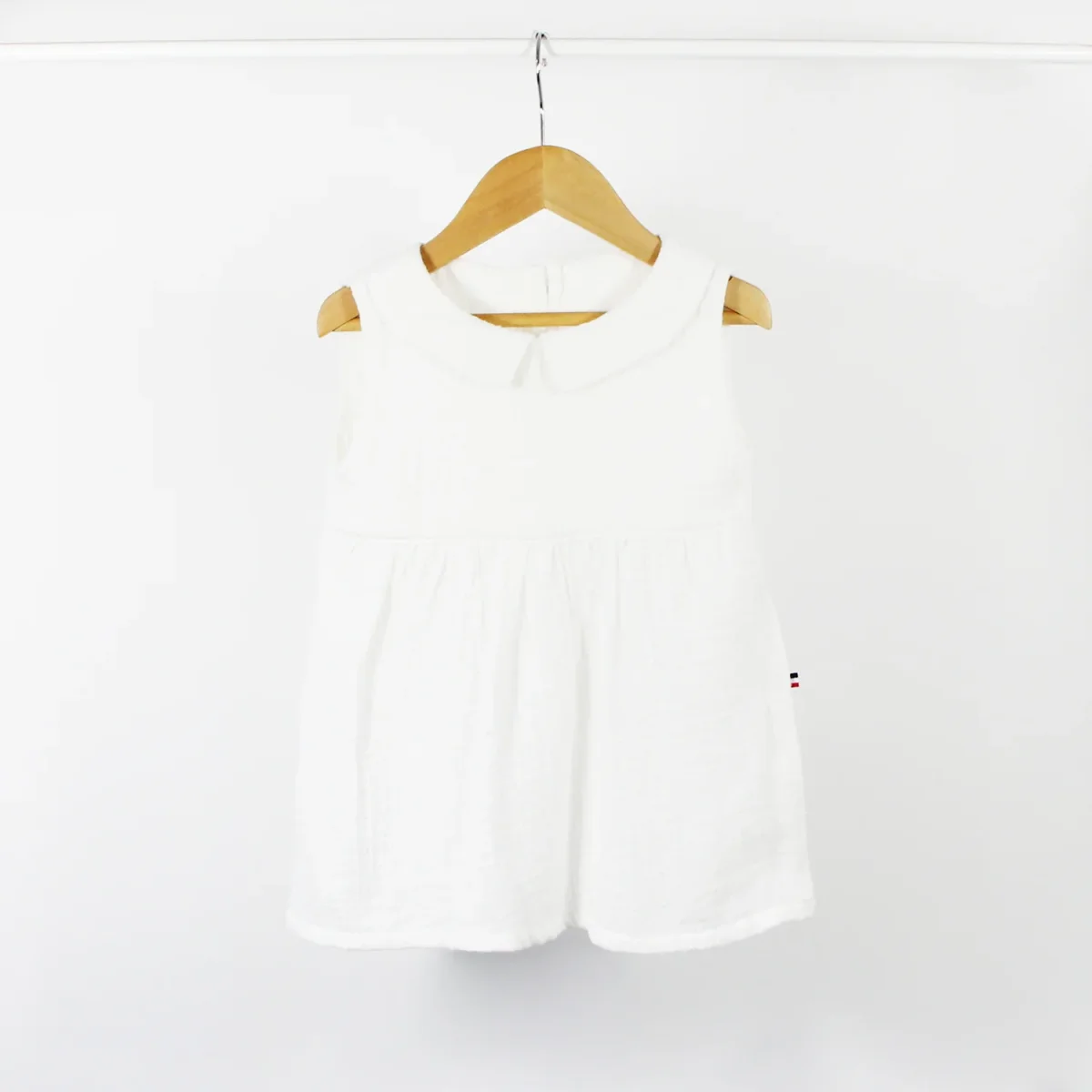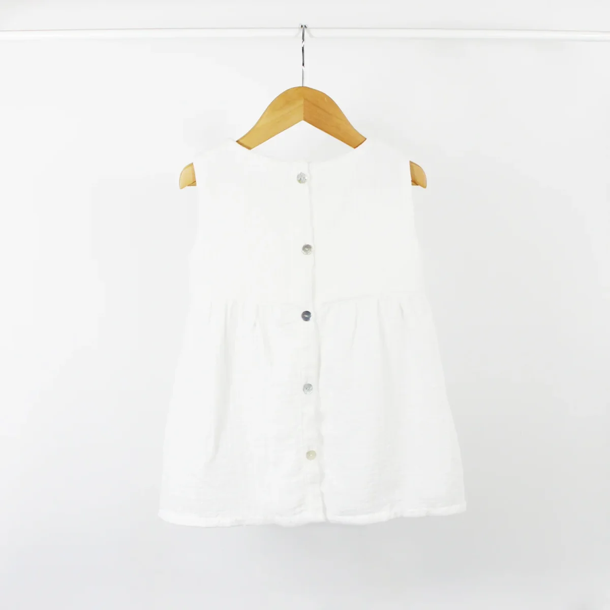 Robe cérémonie enfant sans manche en double gaze de coton plumetis blanc.