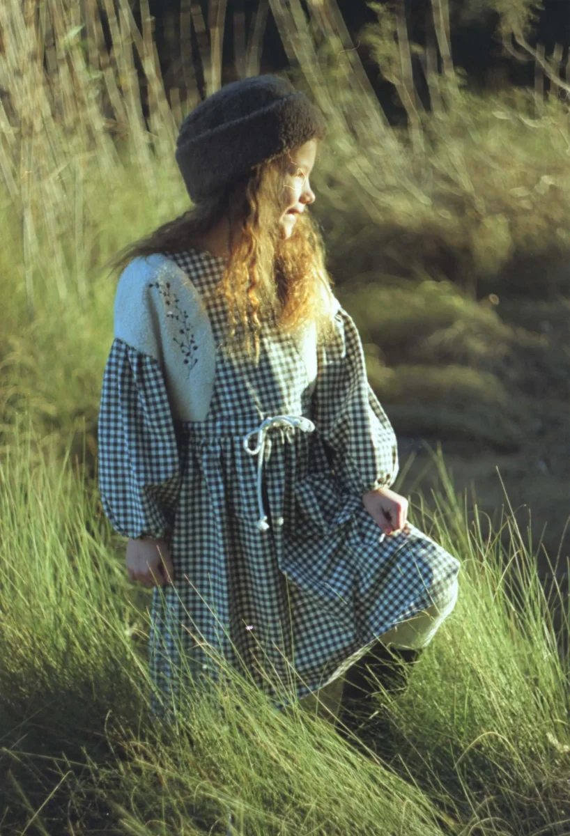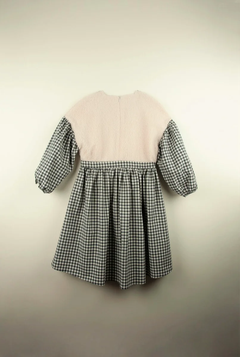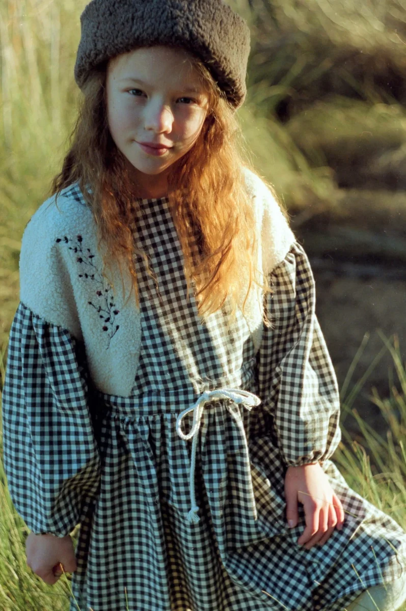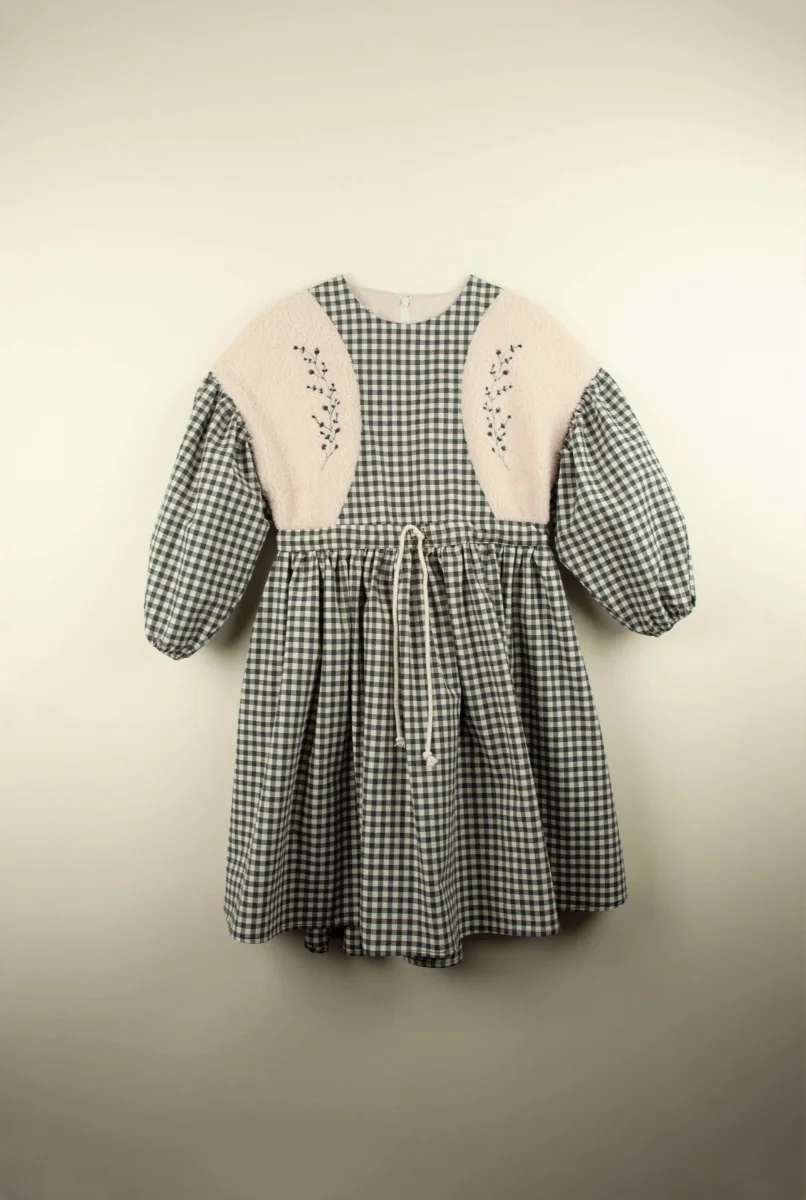 Très belle allure garantie avec cette robe Ingrid Vichy. Robe avec côtés contrastés en moumoute écrue brodés avec un design floral exclusif. Manches longues, légèrement bouffantes avec poignets froncés.