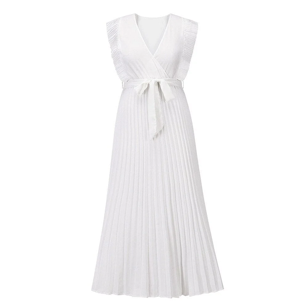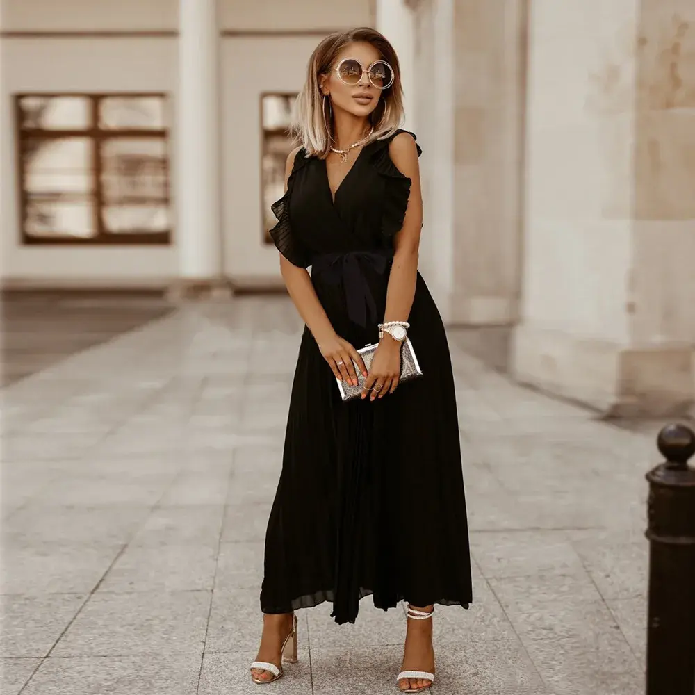 Cette robe maxi élégante sans manches est conçue pour apporter légèreté et assurance aux tenues d’été. Son col en V flatteur et sa structure plissée créent une silhouette élancée et féminine. Les détails à volants ajoutent une touche délicate sans alourdir le style. Légère et agréable à porter, elle accompagne chacun de vos mouvements avec élégance. Parfaite pour les événements d’été, les vacances ou les journées habillées décontractées, cette robe allie raffinement et confort. Une pièce remarquable aussi belle que facile à porter.