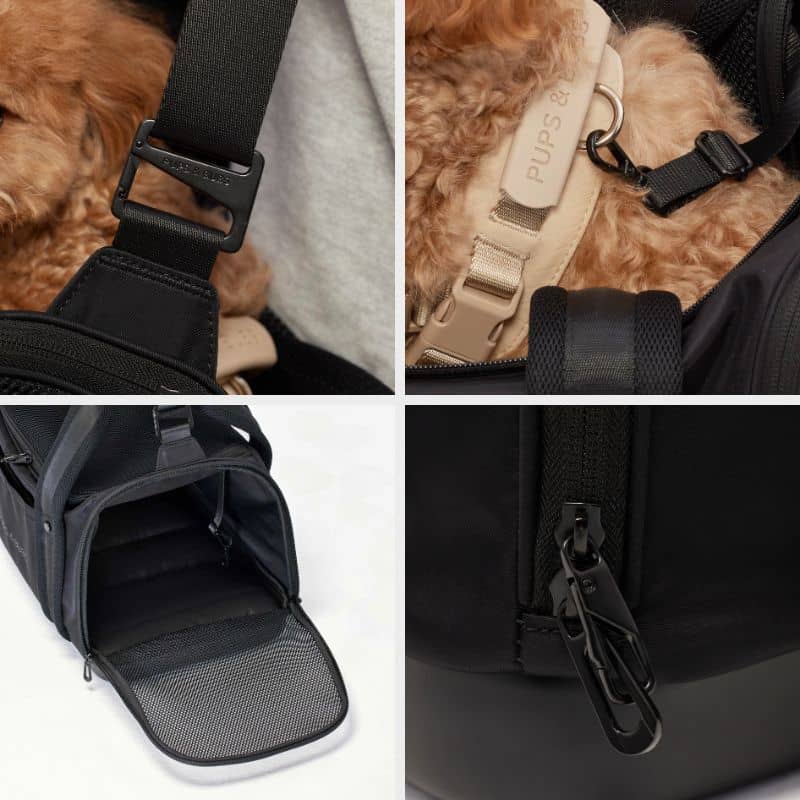 Ce sac allie design et confort mais n’en oublie pas moins la sécurité : toutes les fermetures éclairs peuvent être bloquées grâce à un mousqueton et une sangle de sécurité est prévue pour attacher le chien à l’intérieur du sac.