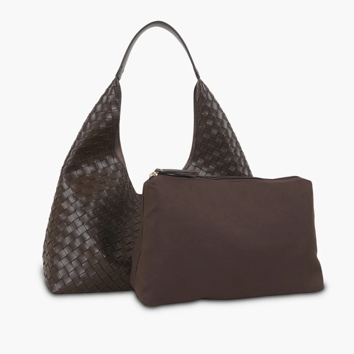 Sac hobo souple, tressé Anse portée épaule Fermeture zippée 1 pochette zippée intérieure amovible Coloris : marron foncé 85% PVC, 14% polyester, 1% fer Dimensions : 49 x 27 x 14 cm