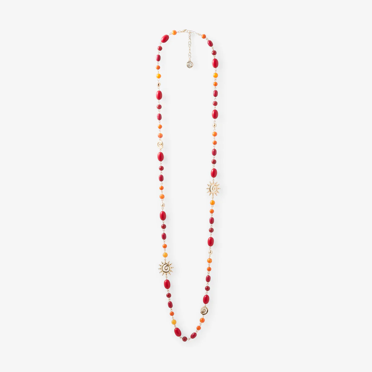 Sautoir à perles et soleil Fermoir à mousqueton, longueur ajustable Coloris : rouge, orange, jaune Matériaux : acrylique, acier, zinc Longueur : 85cm + 5cm