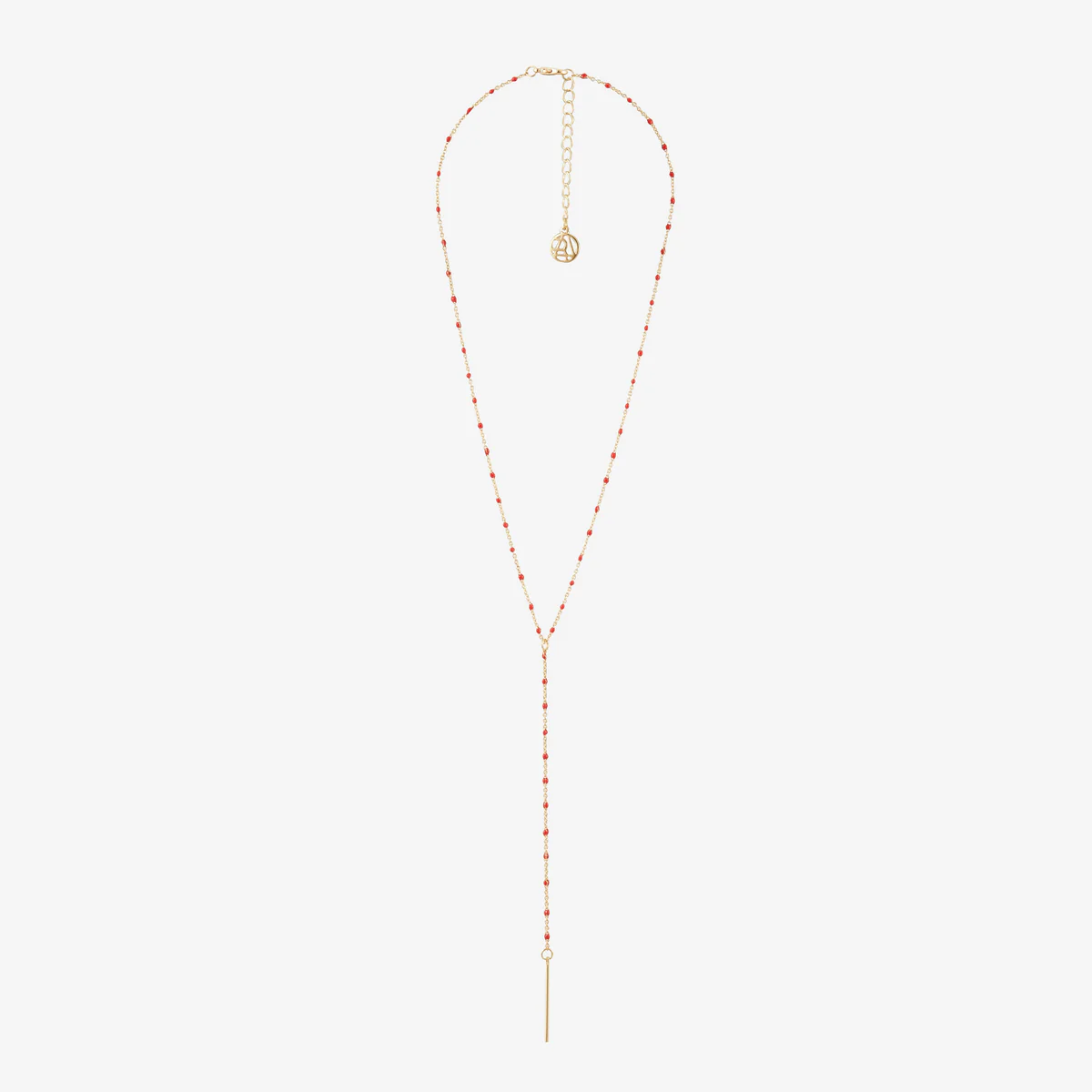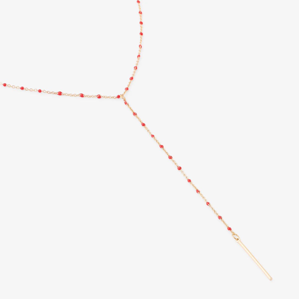 Sautoir en forme de Y, chaine fine et époxy Coloris : rouge, doré 80% fer, 20% époxy Longueur : 44/10 + 5 cm