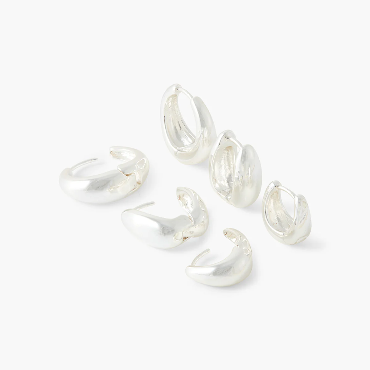 Set de 3 créoles Fermoir à charnière Coloris : argenté Matériaux : zinc et acier Dimensions :13 x 15/14 x 17/20 x 19 cm