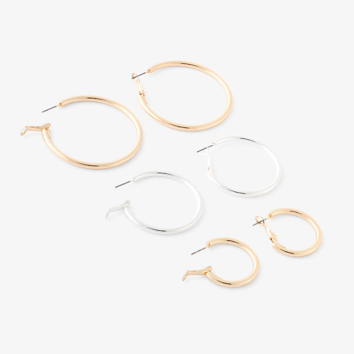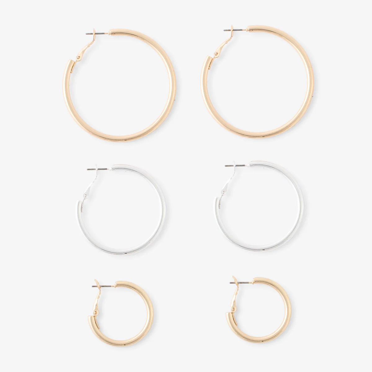 Set de 3 paires de créoles de tailles différentes Fermoir à charnière Coloris : doré, argenté 100% acier Diamètre : 3 cm / 4 cm / 5 cm