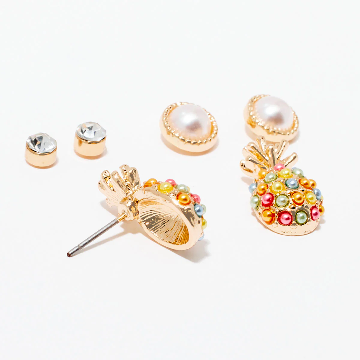 Set de 3 puces d’oreilles 1 paire en forme d’ananas Fermoir à poussette Coloris : doré, nacré et multicolore Dimensions : 1,7 cm (longueur) / 0,8 cm (diamètre) et 0,4 cm (diamètre)