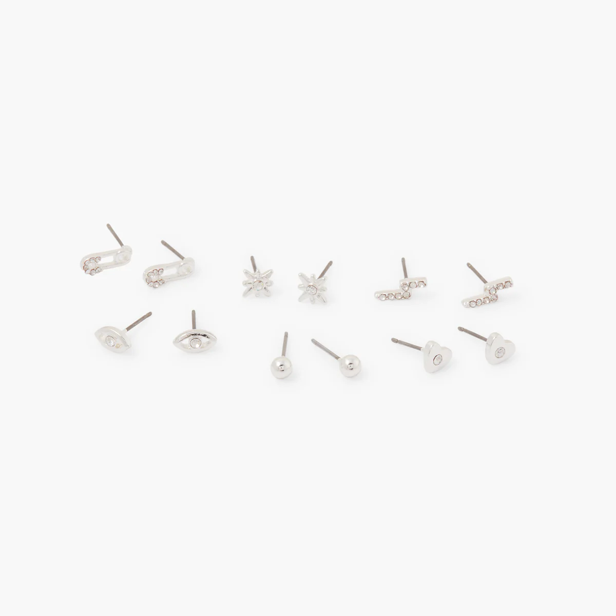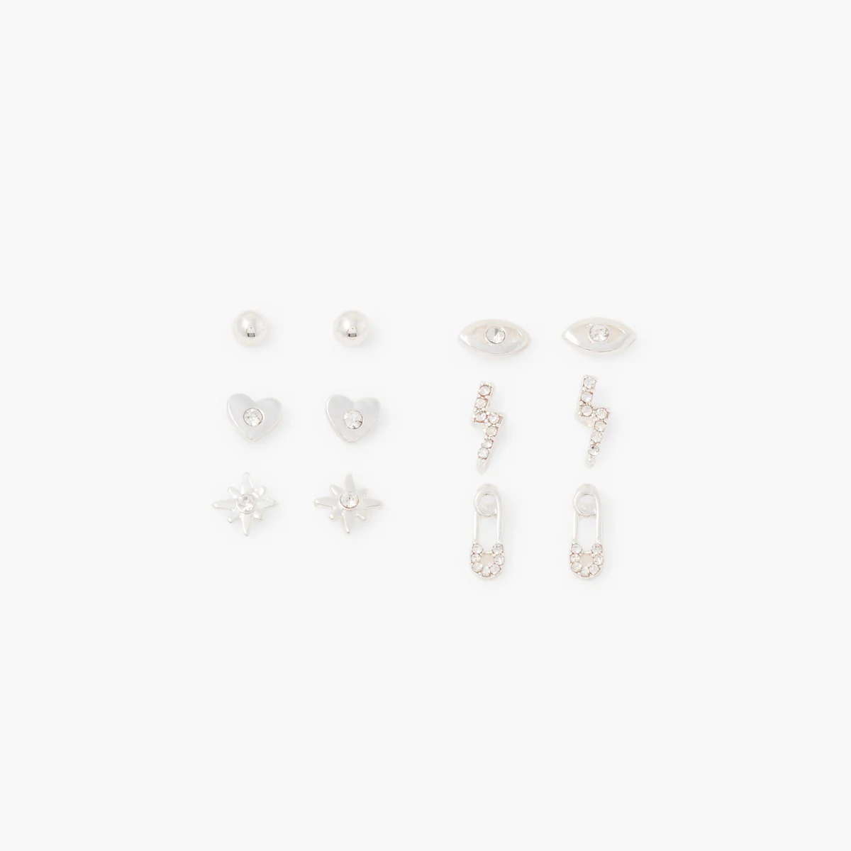 Set de 6 paires de petites puces d’oreilles assorties Fermoir à poussette Coloris : argenté 70% zinc, 20% verre, 10% polypropylène Dimensions : 1 cm
