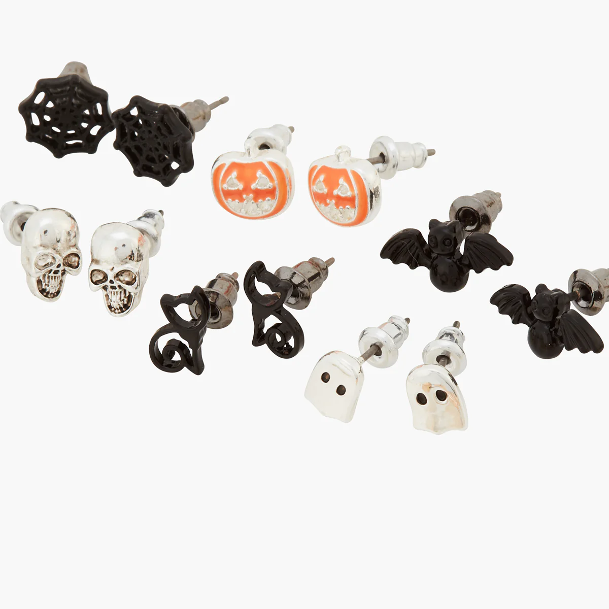 - Set de 6 paires de puces d’oreilles Halloween : fantômes, citrouilles, chauve-souris, toiles d’araignées, chats noirs, têtes de mort