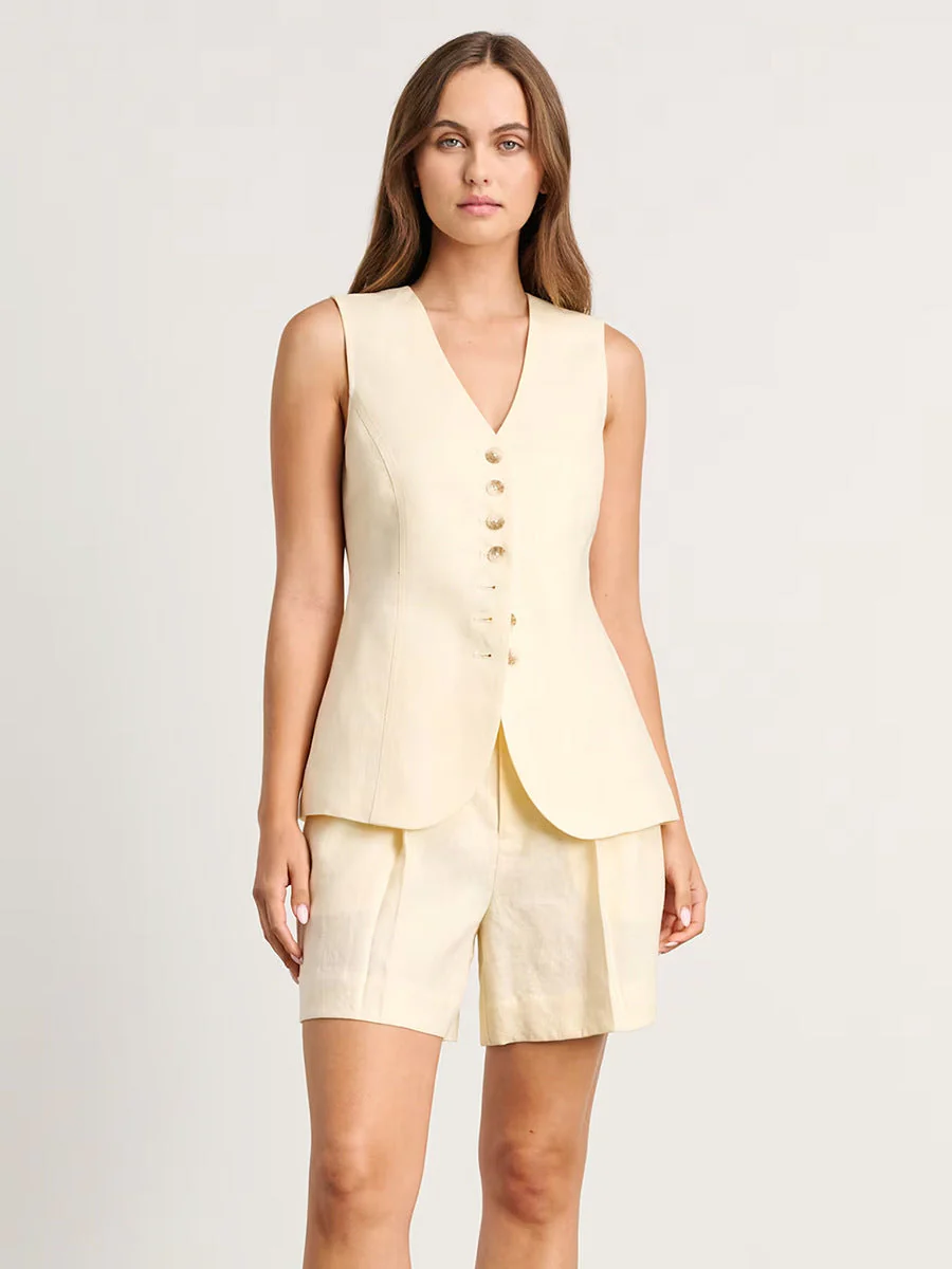 - Design structuré mais décontracté : Le gilet apporte une coupe nette et chic tandis que le short fluide assure un confort sans contraintes.