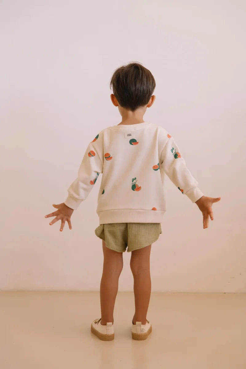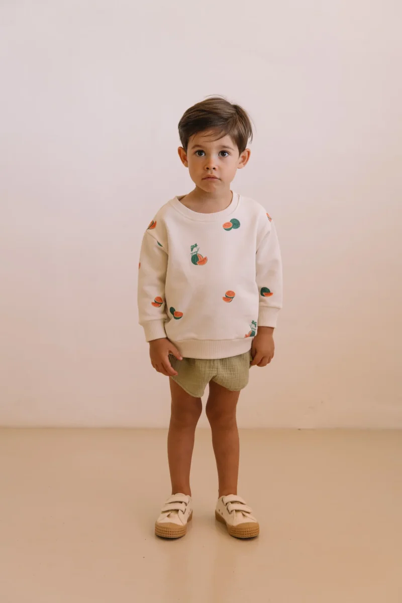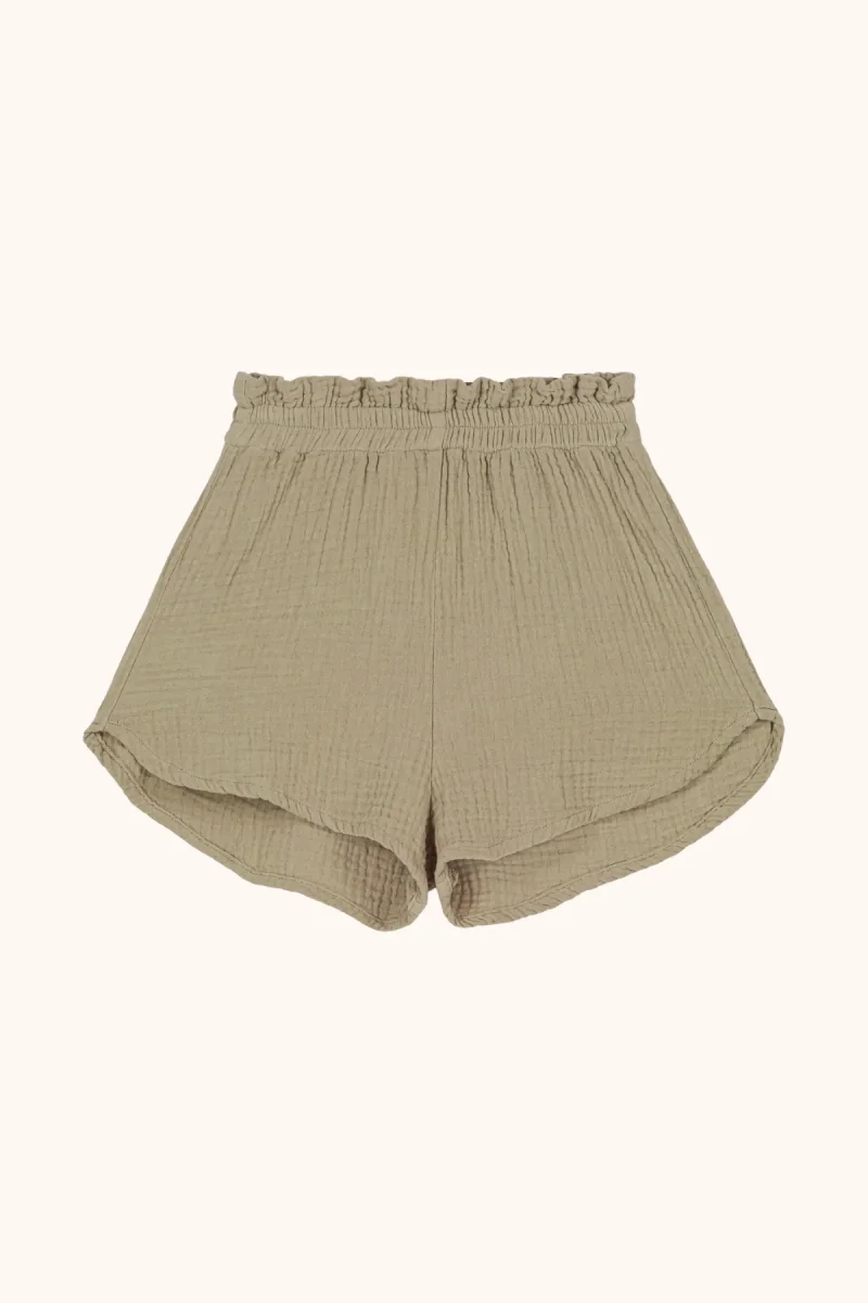 Short en gaze froissée de coton biologique. Taille élastiquée et petite poche arrière.