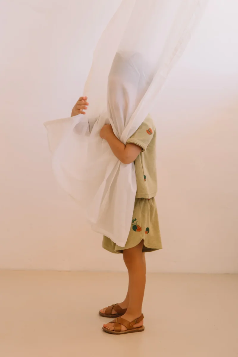 Short confortable en jersey éponge de coton biologique.Taille élastiquée et petite poche arrière. Etiquette décorative Studio Bohème au dos du short.Fabriqué au Portugal.