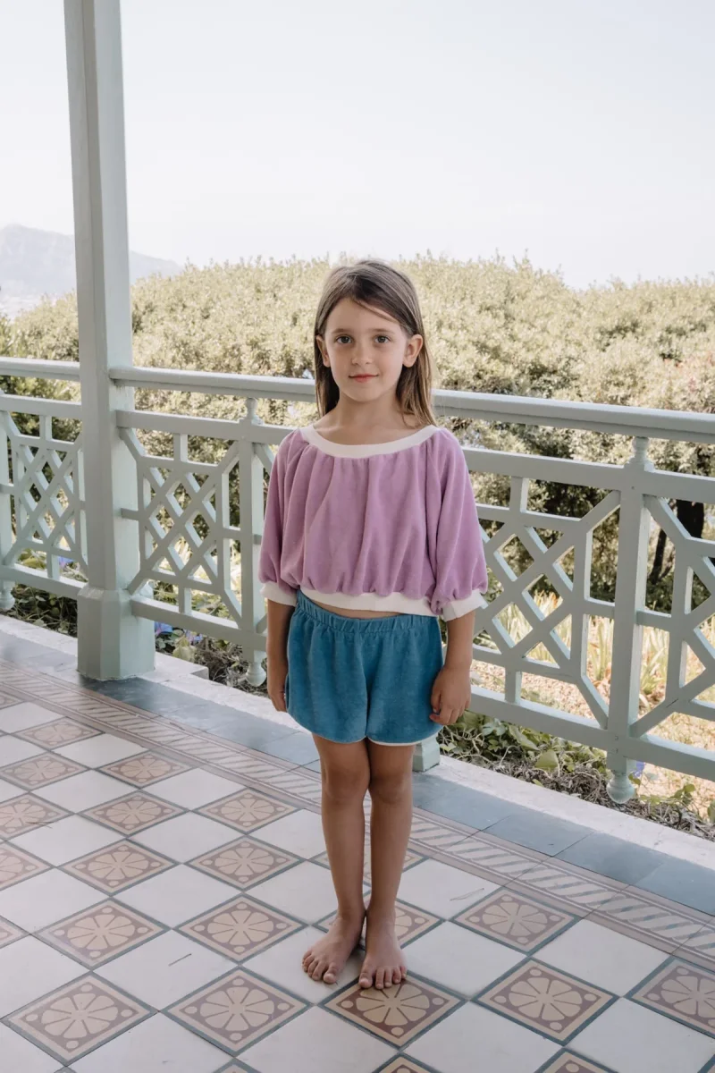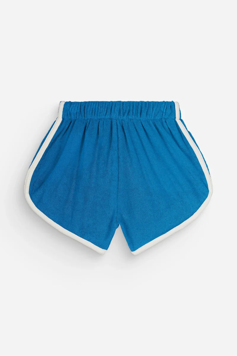 Short bleu ciel avec taille élastique, bord côte vanilla contrastant. Matière éponge toute douce et absorbante en coton bio.