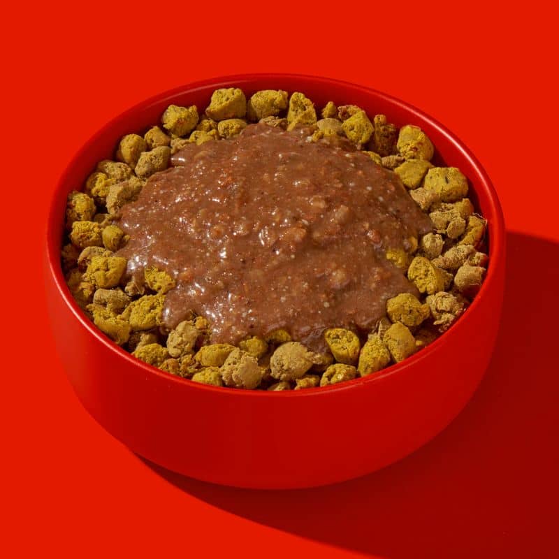 Composition : bouillon de viande 59,6%, viande musculaire de bœuf 26%, betterave 10%, églantier 3,4%, semoule de pomme de terre 1%