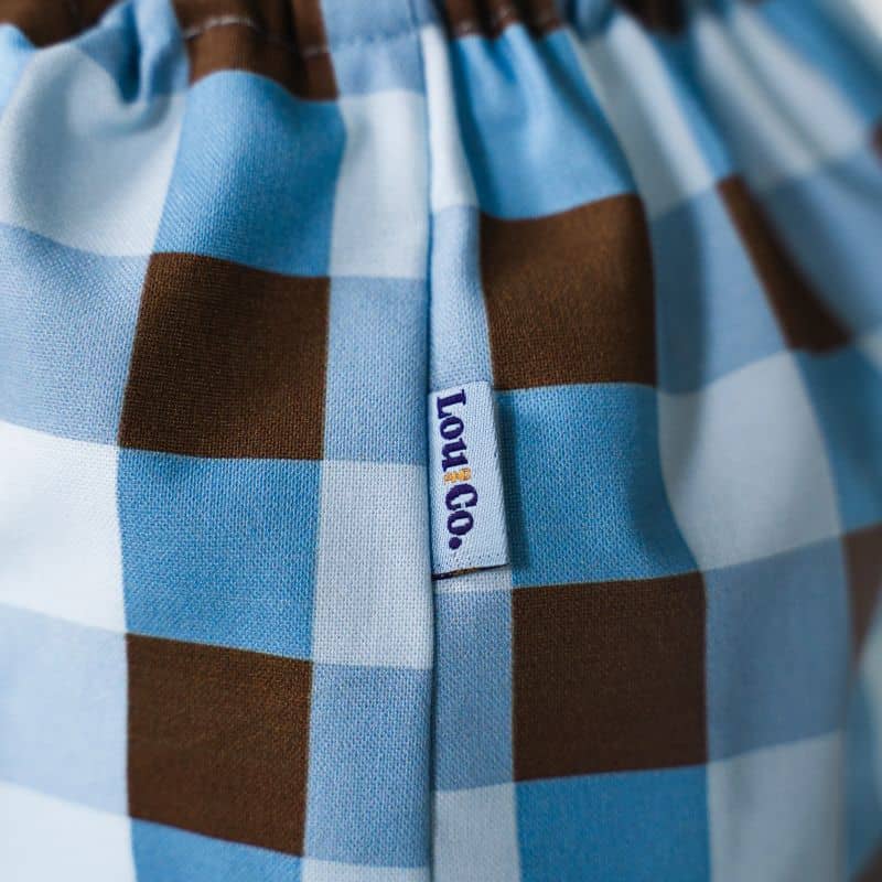 Ce snood pour chien en coton à carreaux marron et bleu est confectionné à la main par Lou & Co.