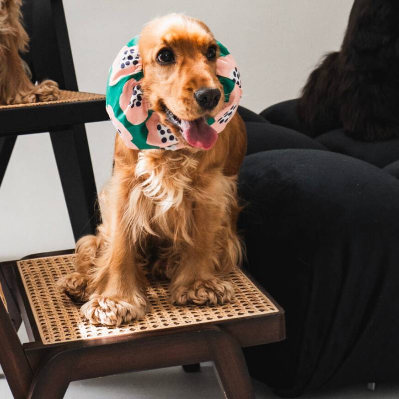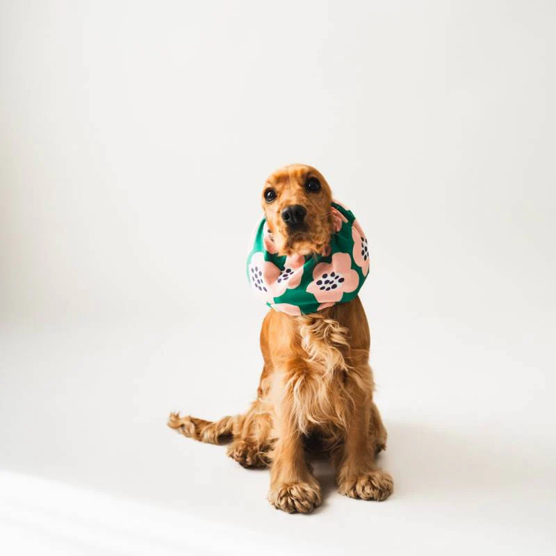 Ce snood pour chien en coton vert à fleurs est confectionné à la main par Lou & Co.
