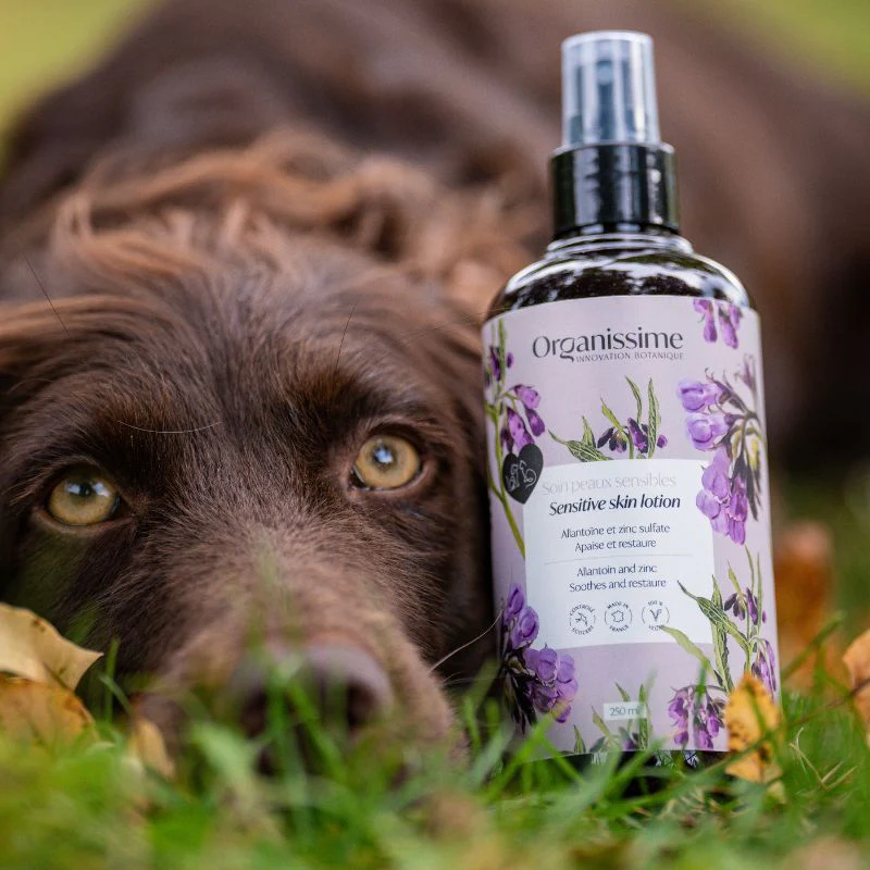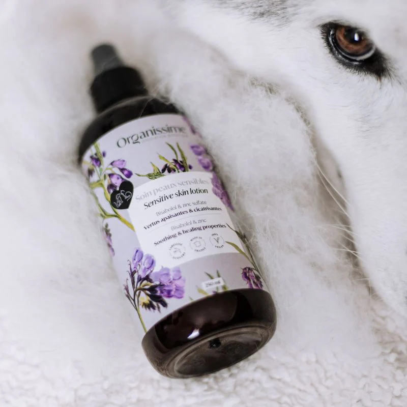 Ce soin peaux sensibles pour chien en spray Organisime by Biogance, certifié Ecocert, est formulé à base de bisabolol et de zinc sulfate pour apaiser et soulager les peaux irritées chez le chien ou le chat.