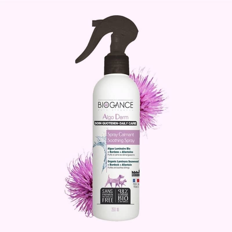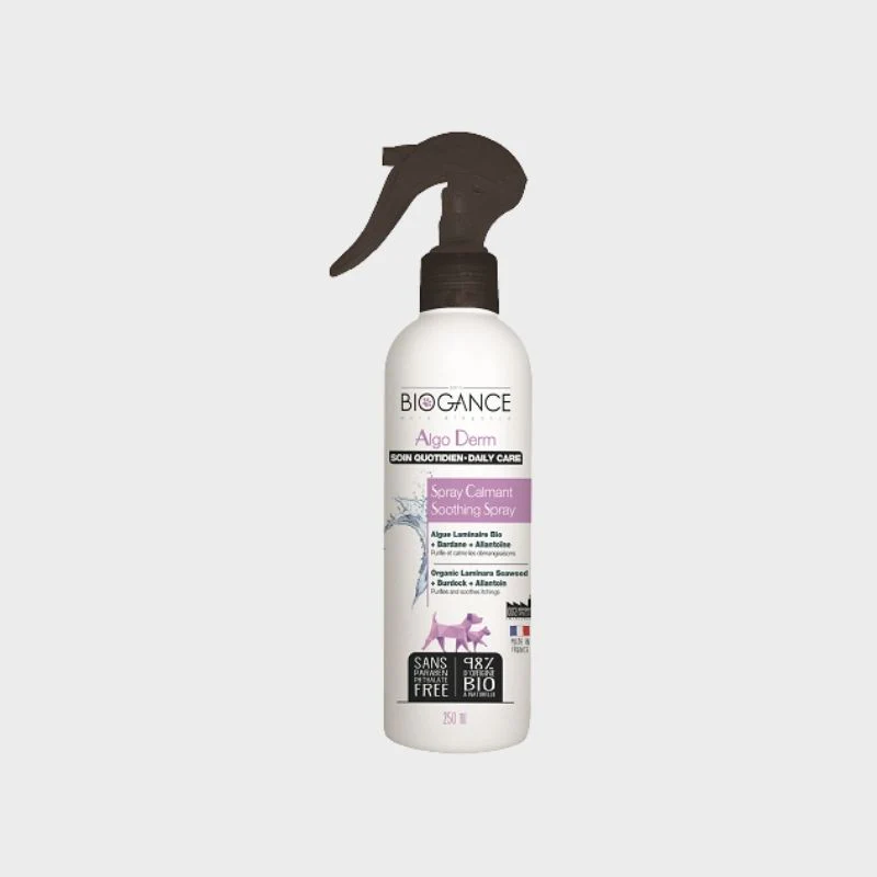 Ce spray “Algo Derm” Biogance est un soin sans rinçage formulé à base d’algues bio laminaires et extrait de bardane et d’allantoïne pour apaiser et soulager les peaux irritées chez le chien ou le chat.