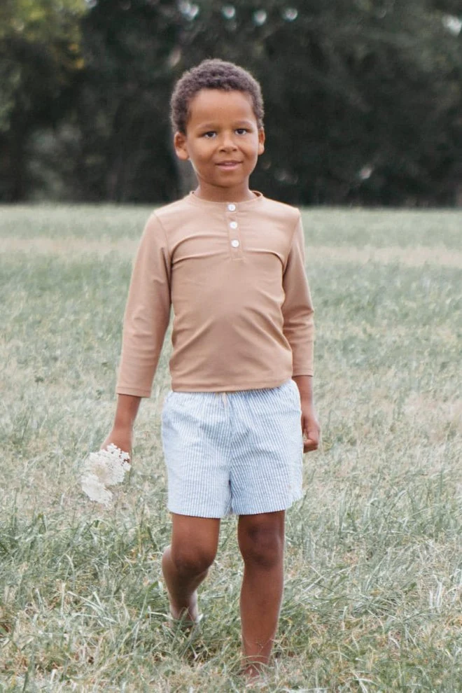 Élégant haut de maillot anti UV camel doré pour garçon. La meilleure des protections : UPF 50+ (filtre 98% des UV).