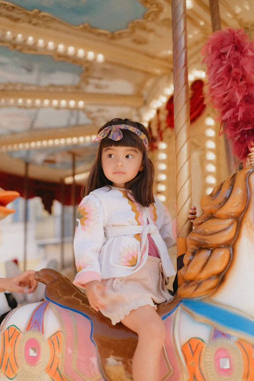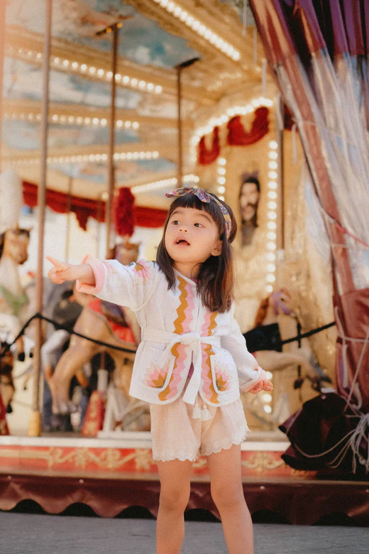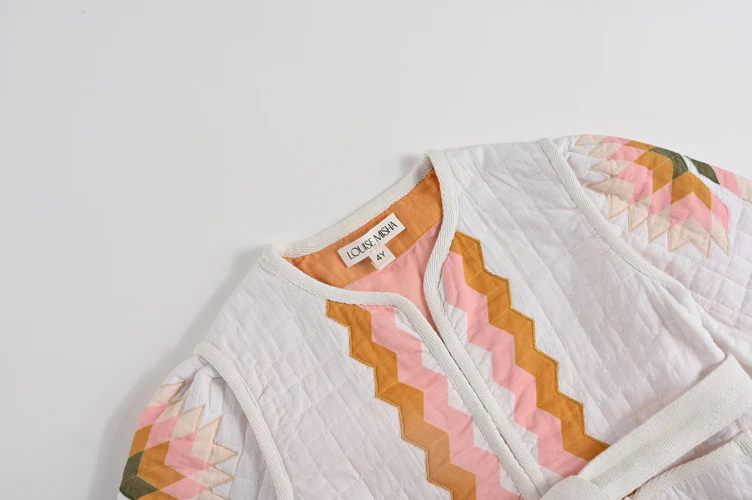 Le motif géométrique est clairement d’inspiration folklorique. Tous ses détails sont les signes d’un savoir-faire artisanal : biais contrastés herringbone sur le contour aux poches et aux emmanchures, passants et ceinture herringbone contrastés, patte de boutonnage discrète avec petits crochets. Elle dispose également de 2 poches plaquées avant et d’une doublure contrastée. Se mariera parfaitement avec un short uni comme le Short Souniya bleu clair ou le Short Clemoune Petale.