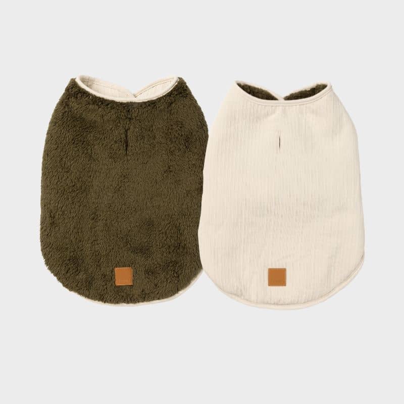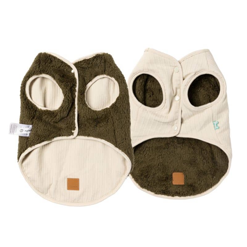 VESTE POUR CHIEN RÉVERSIBLE – POLAIRE KAKI & CÔTELÉ BEIGE « UMEDA »